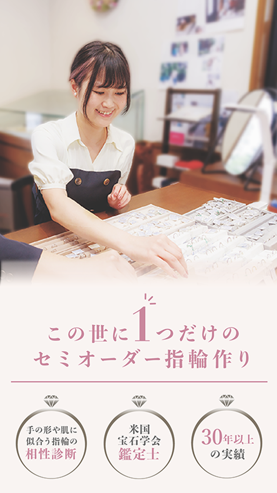 取り扱っている全商品から一部商品を厳選して掲載しております。 商品ページからメインダイヤモンドのサイズや品質を選択可能です。 メレダイヤモンドの個数や種類の変更 リングの素材の変更 等のご要望がございましたら、LINEやお電話にてお気軽にご相談下さい。 選び方がわからない・お相手の指輪のサイズや好みがわからないという方のために、プロポーズプランもご用意しております。