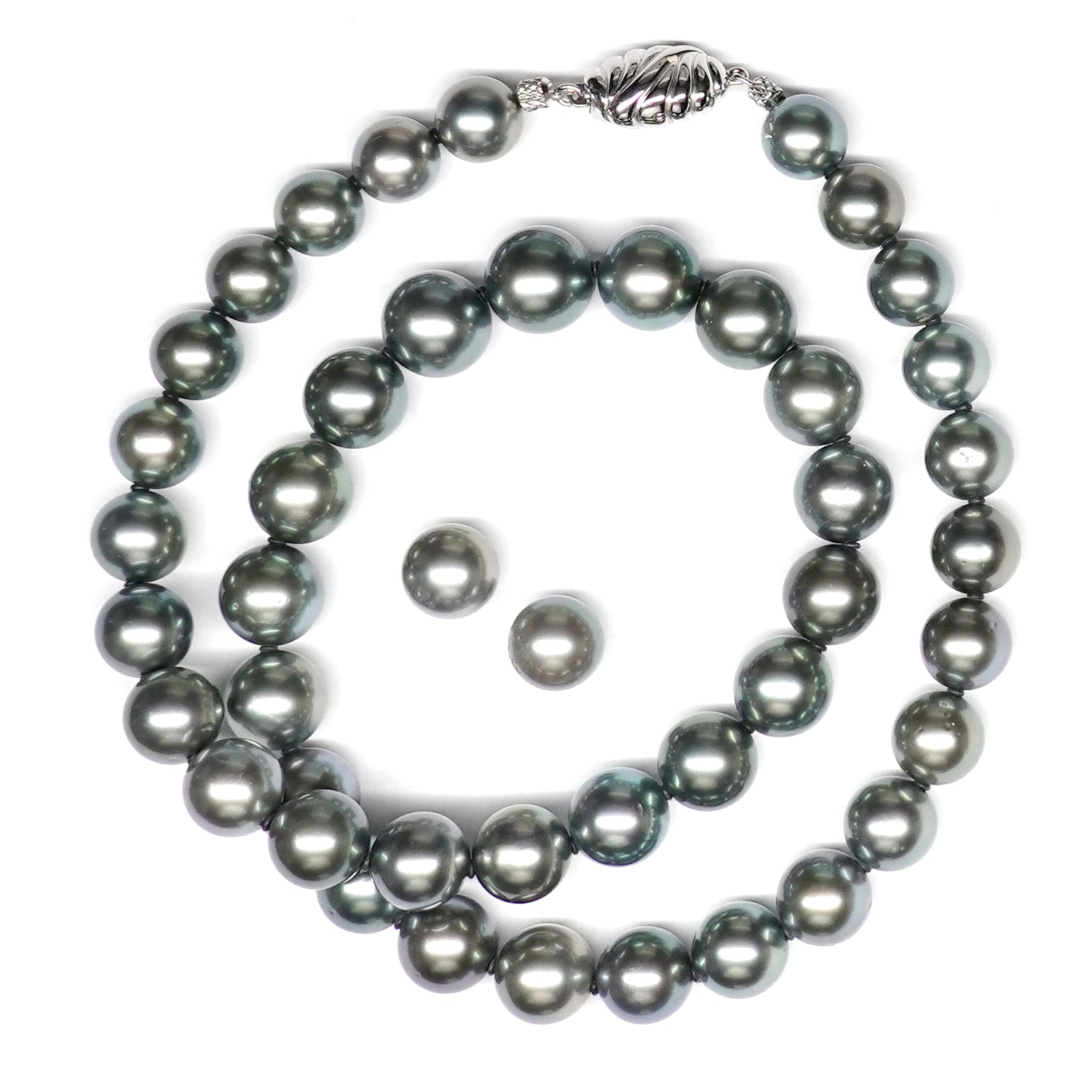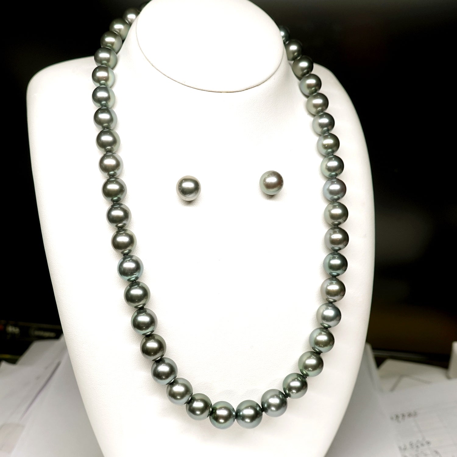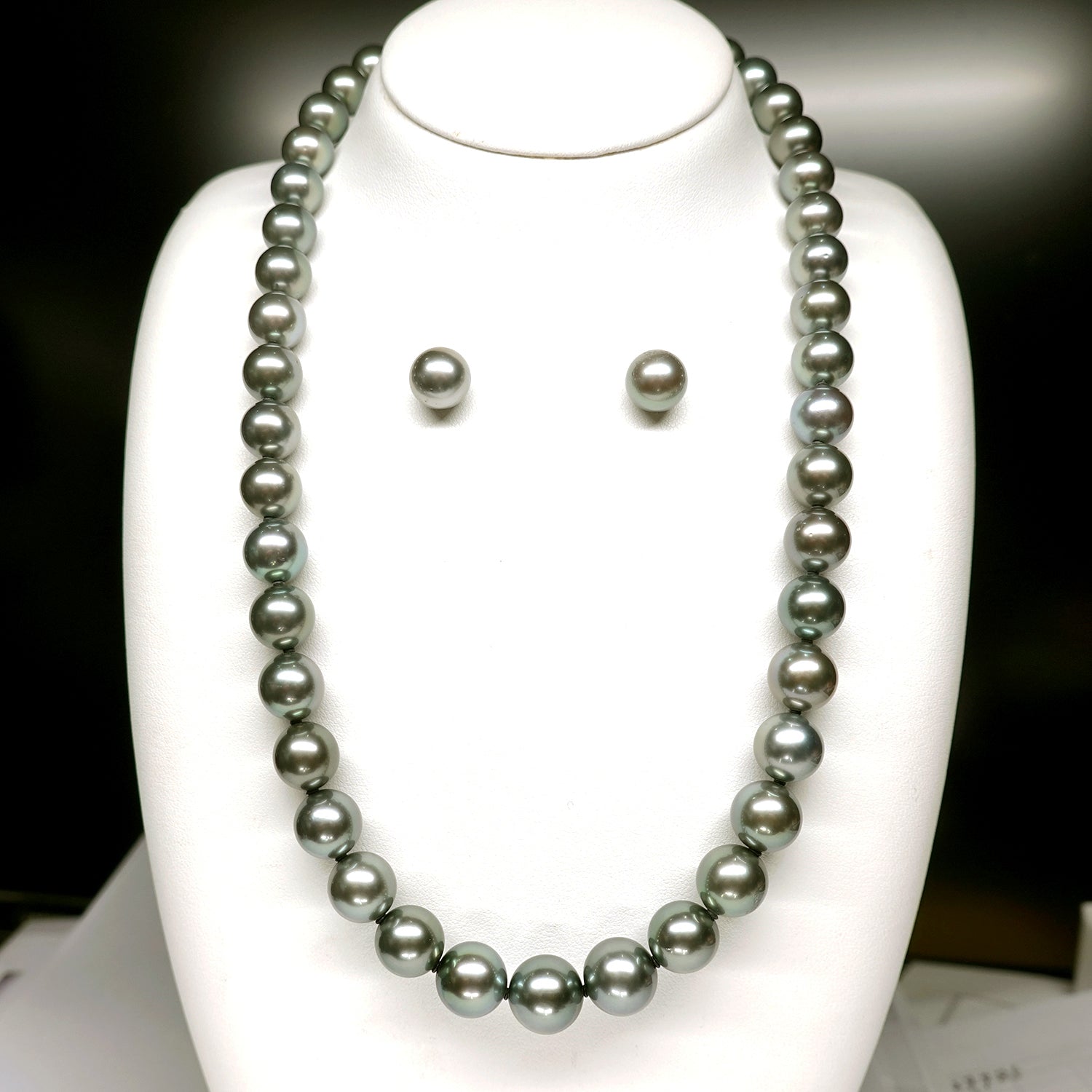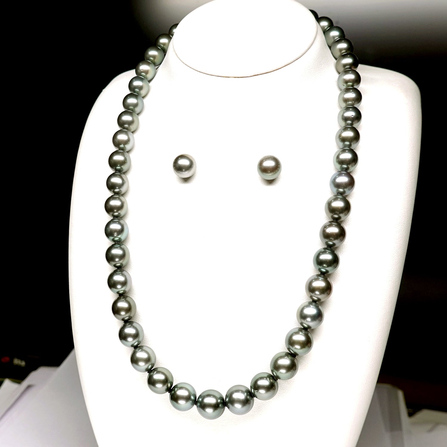 黒蝶真珠ネックレス+イヤリング(ピアス)セット オーロラピーコック グリーン系の光沢のある魅力的な色の高品質な真珠 真珠科学研究所鑑定鑑別書付 KC-N-9.3~11.7mm-SKXXX297