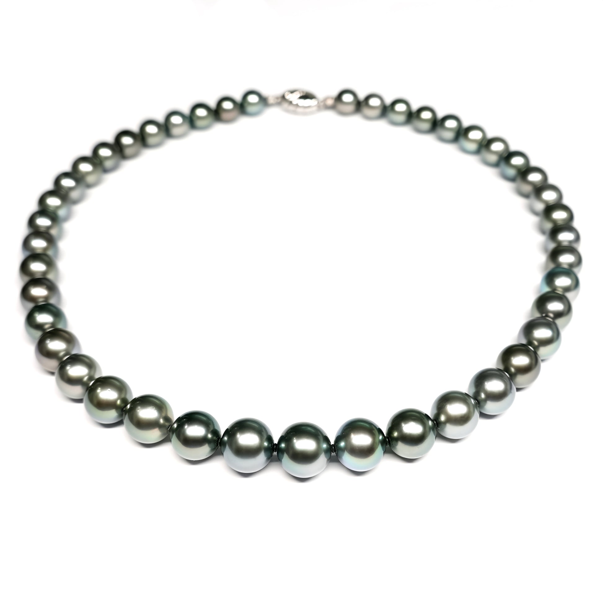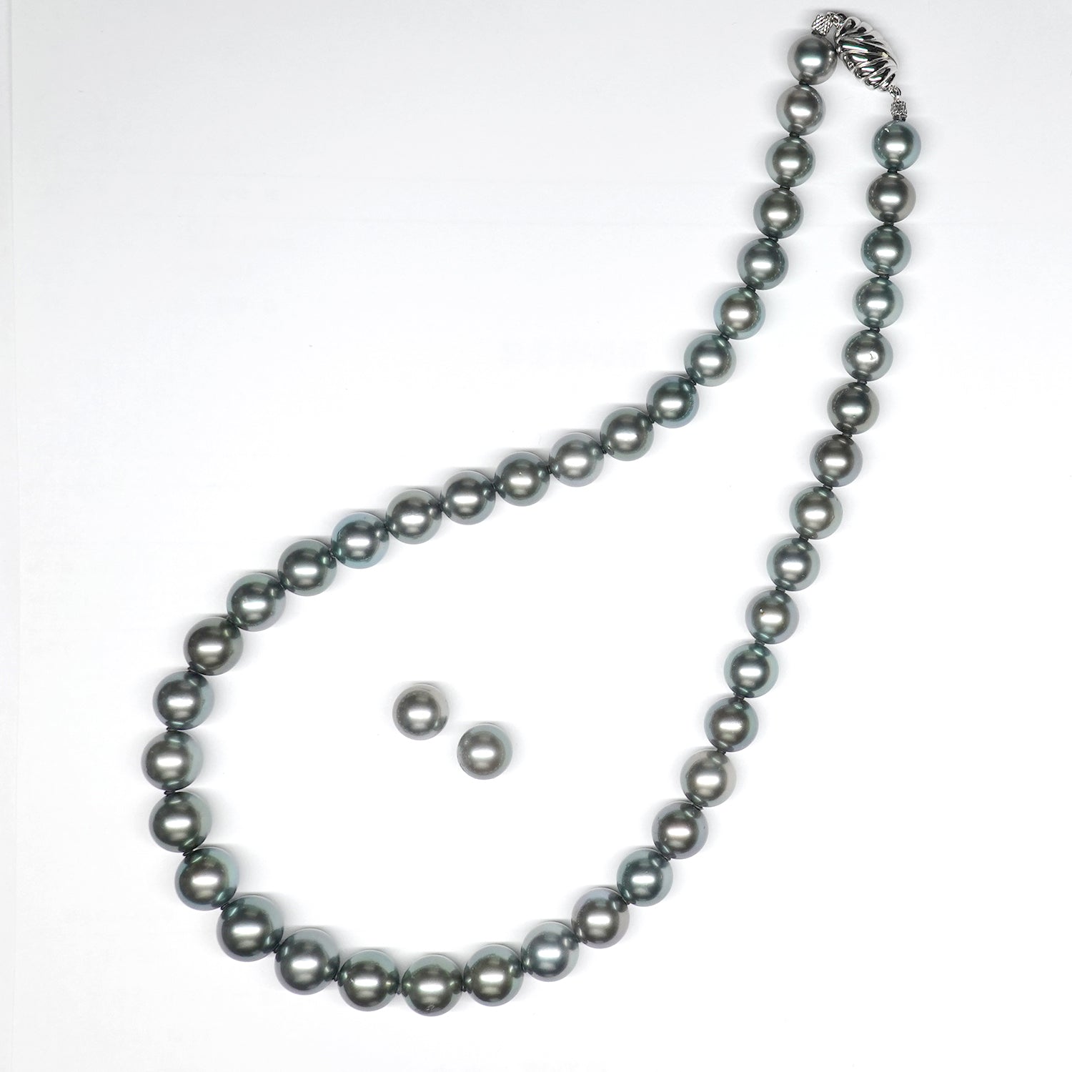 | 黒蝶真珠43個(直径:9.3〜11.7mm) 留め金:SV.クラスプ 長さ:約48.5cm |