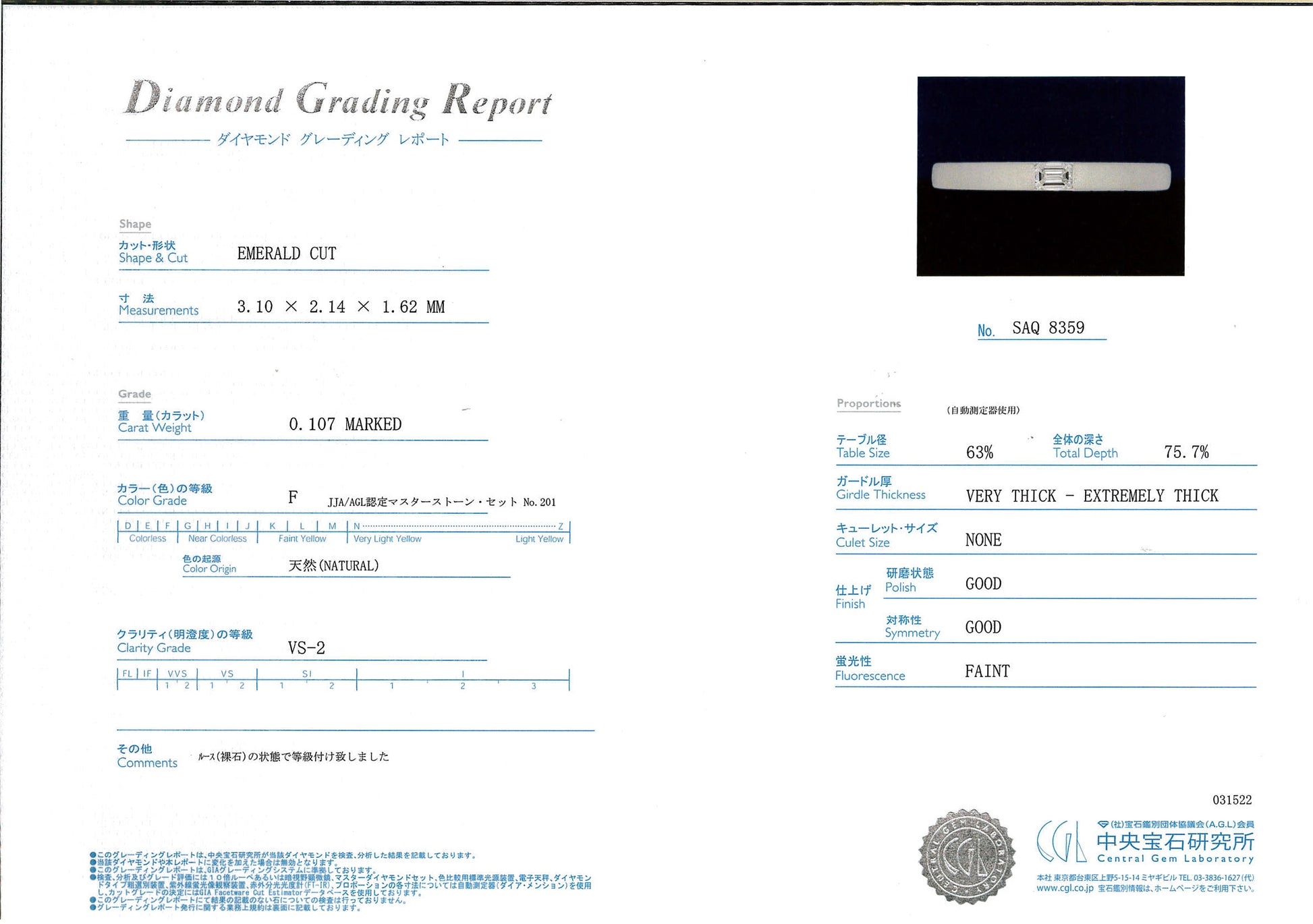 エメラルドカットダイヤモンド:0.107ct・Fカラー・VS2・EM(中央宝石研究所鑑定書付)