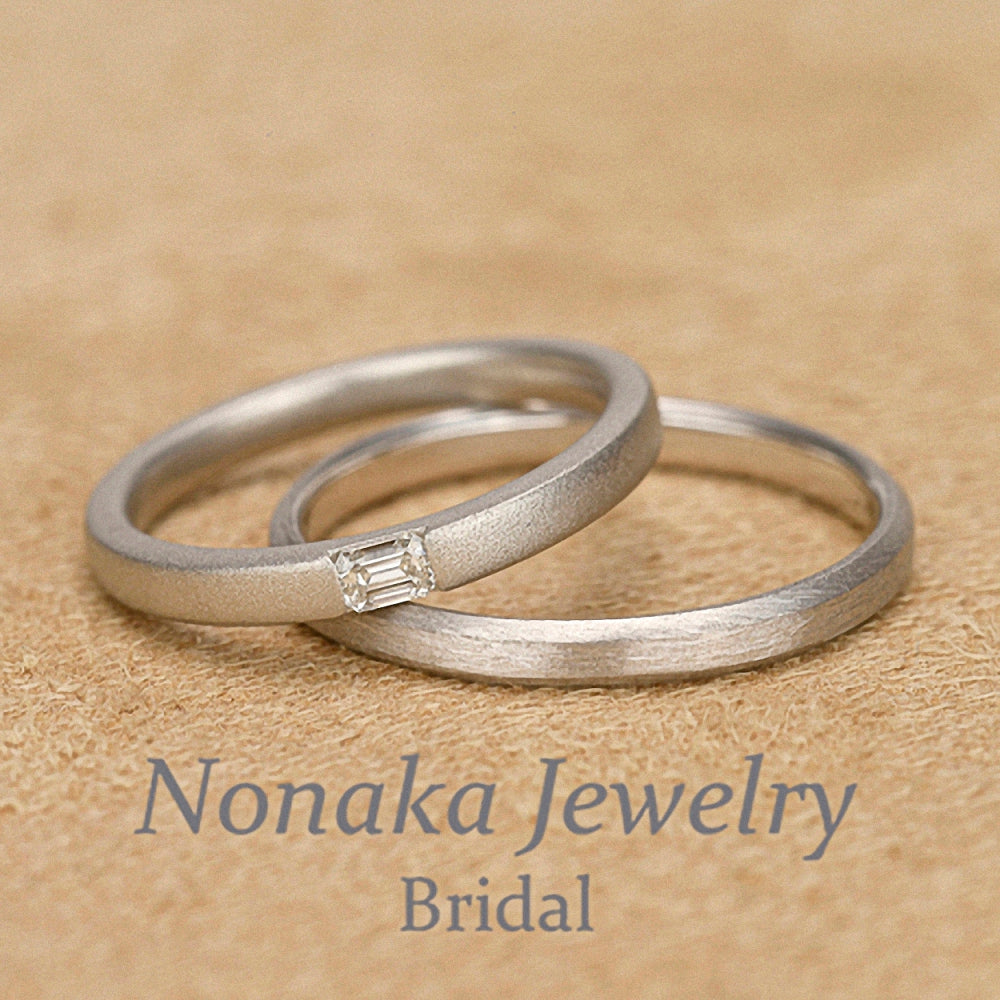 エメラルドカットダイヤモンド結婚指輪ペア つや消し加工のプラチナ製マリッジリング MpJTH-EM01-Pt-ODM10-PtH