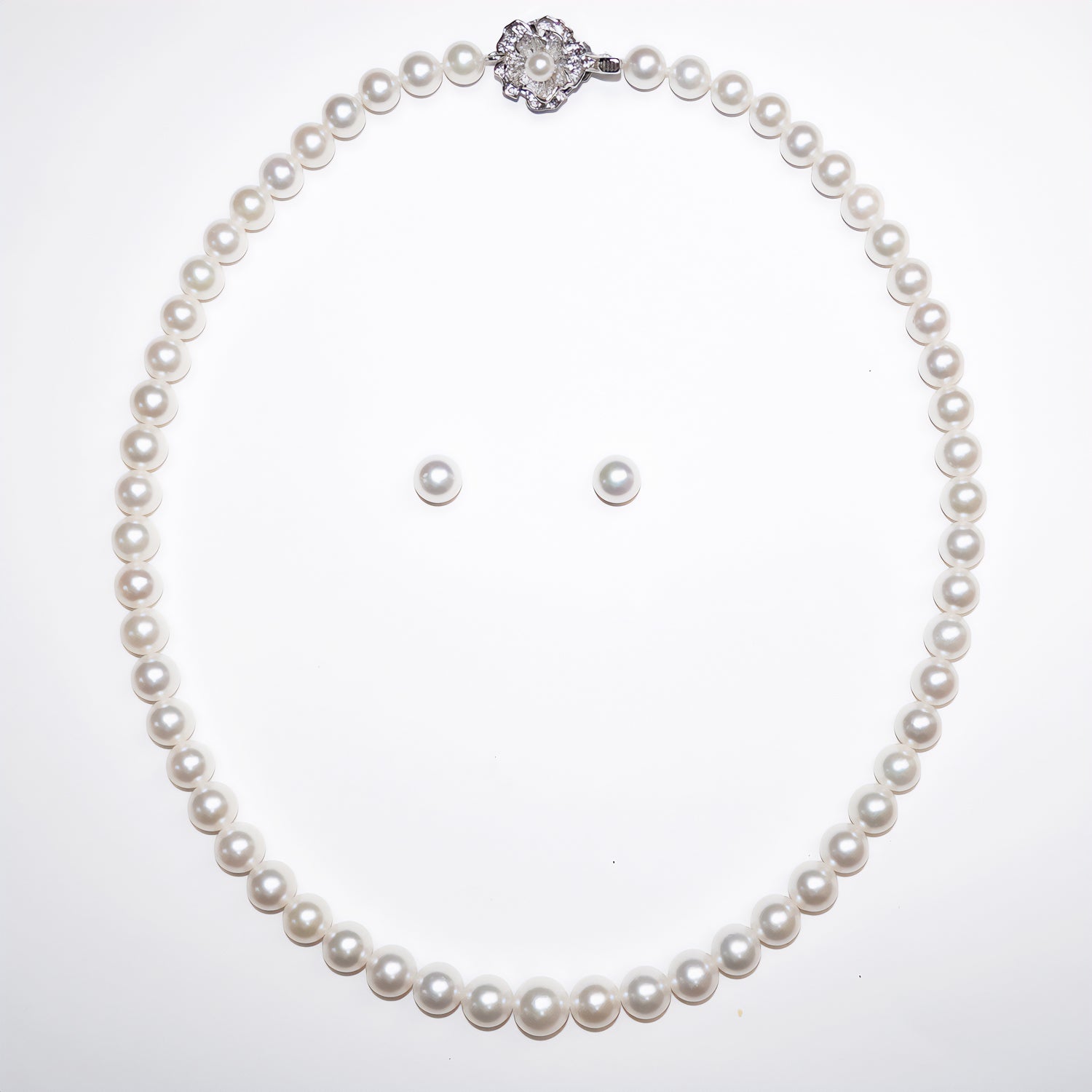 シルバーホワイト系のキズの少ないキレイな真珠です。数個の珠に小キズがありますが目立ちません。