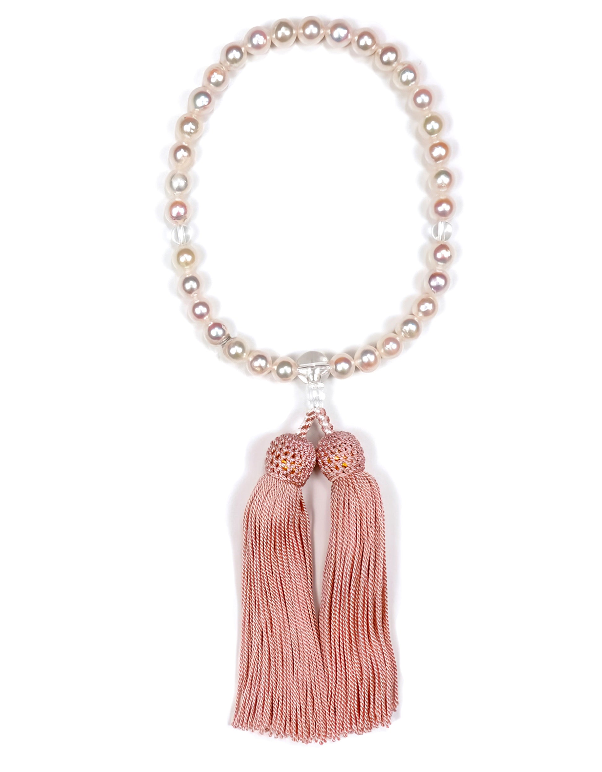 [パール念珠]直径7.5〜8.0mmのアコヤ真珠と水晶、正絹を使用