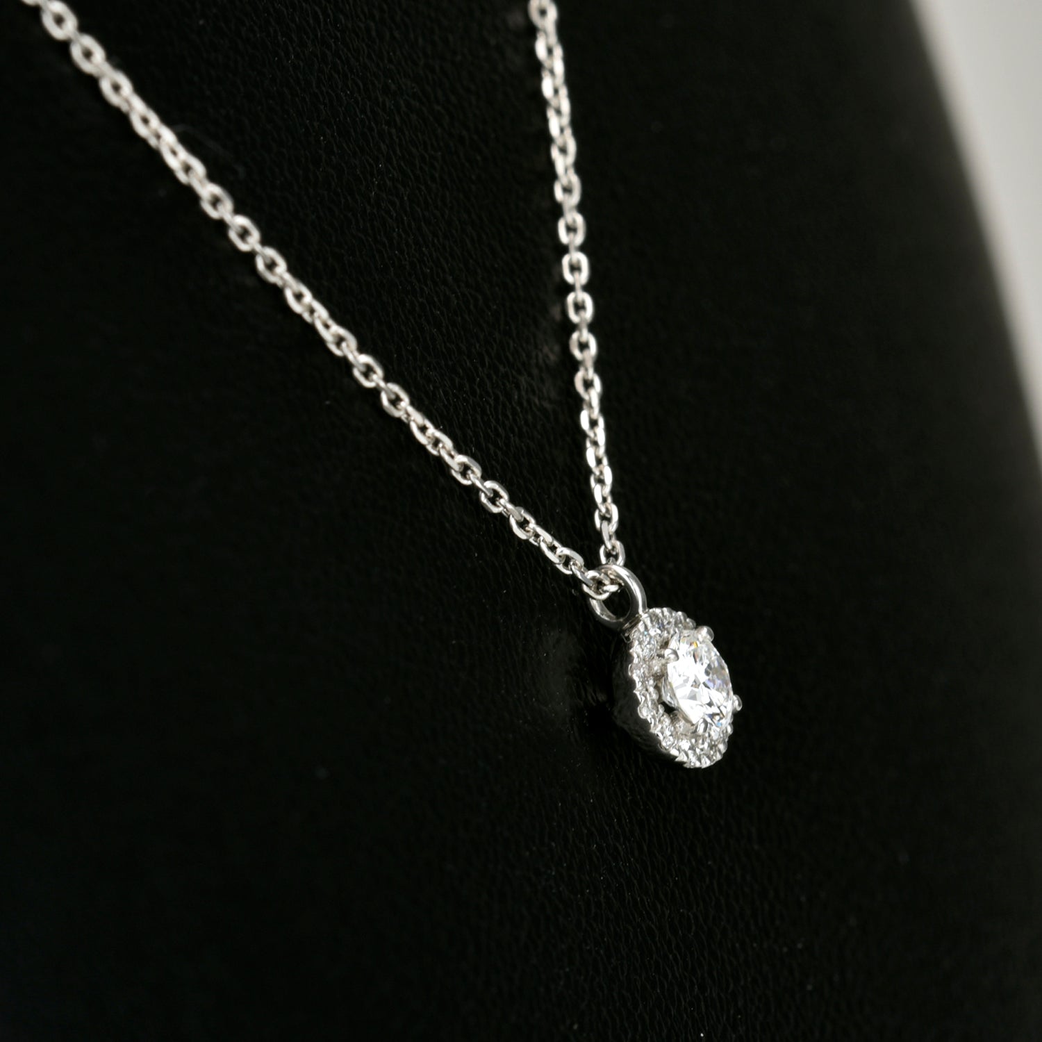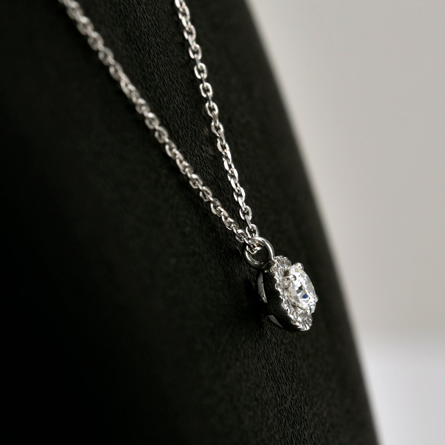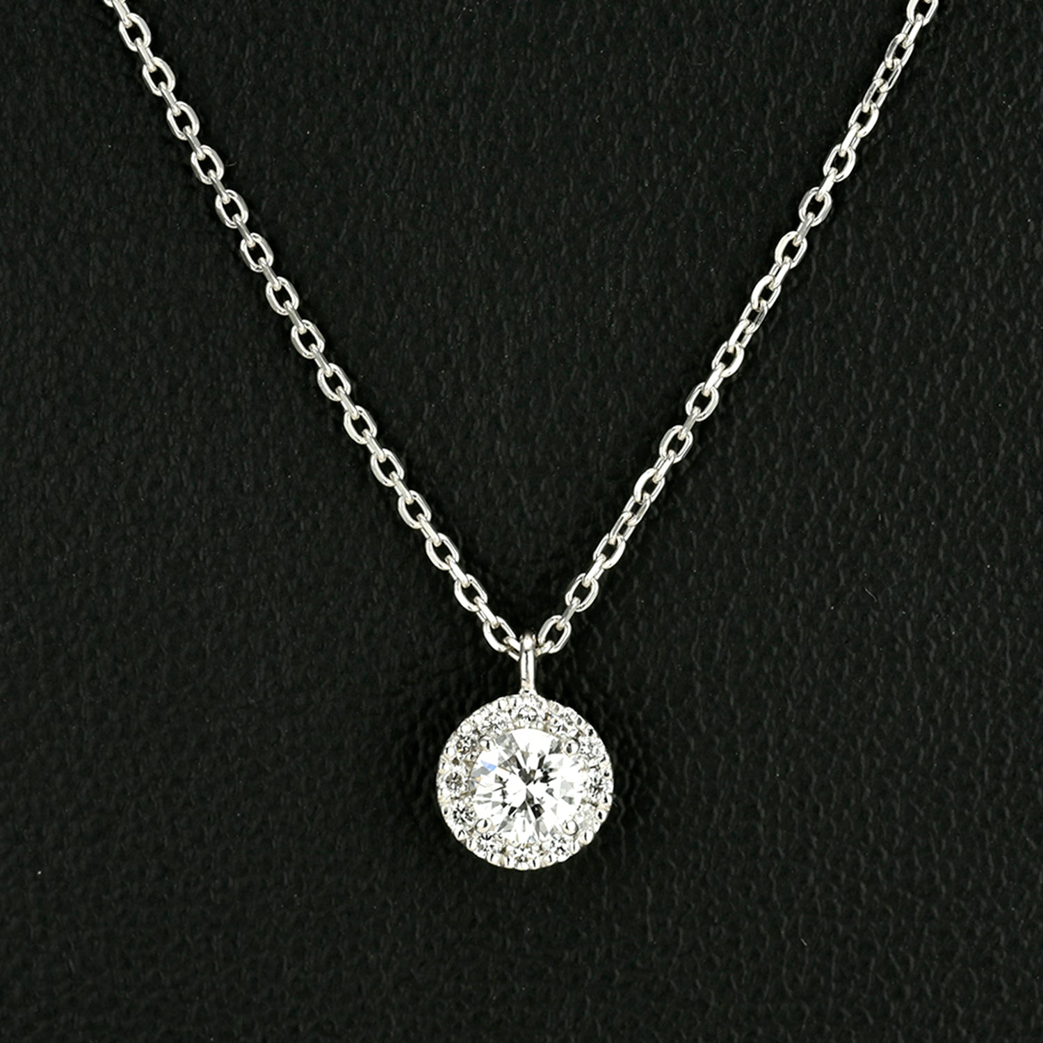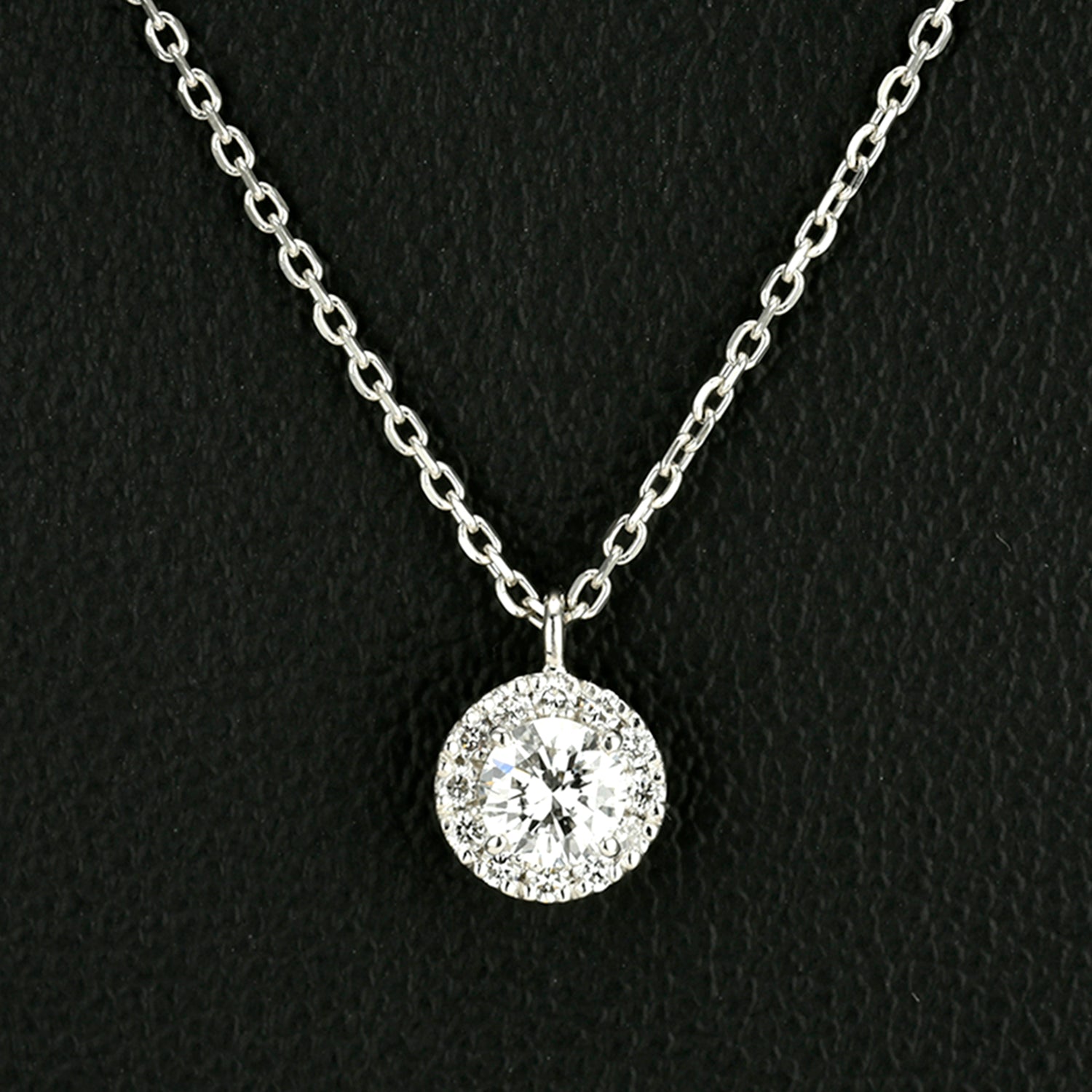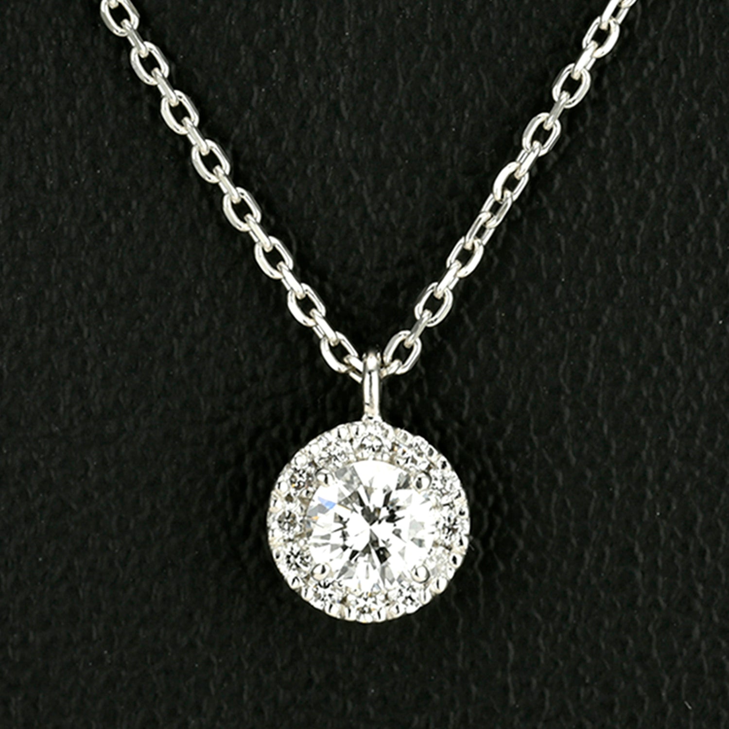カラーとカットが最高のメインダイヤモンドを高品質のH&C(ハートアンドキューピッド)メレダイヤモンドで取り巻くことで、非常に輝きが良く、存在感のあるペンダントになりますた。
