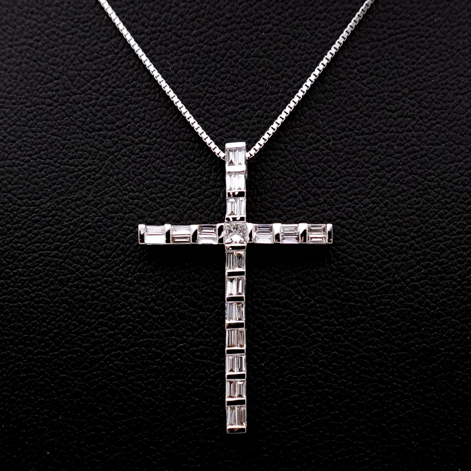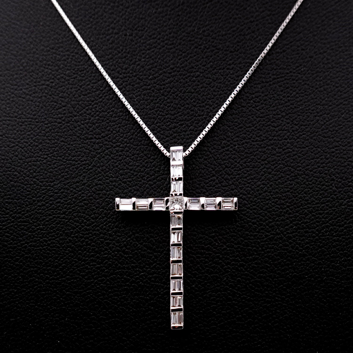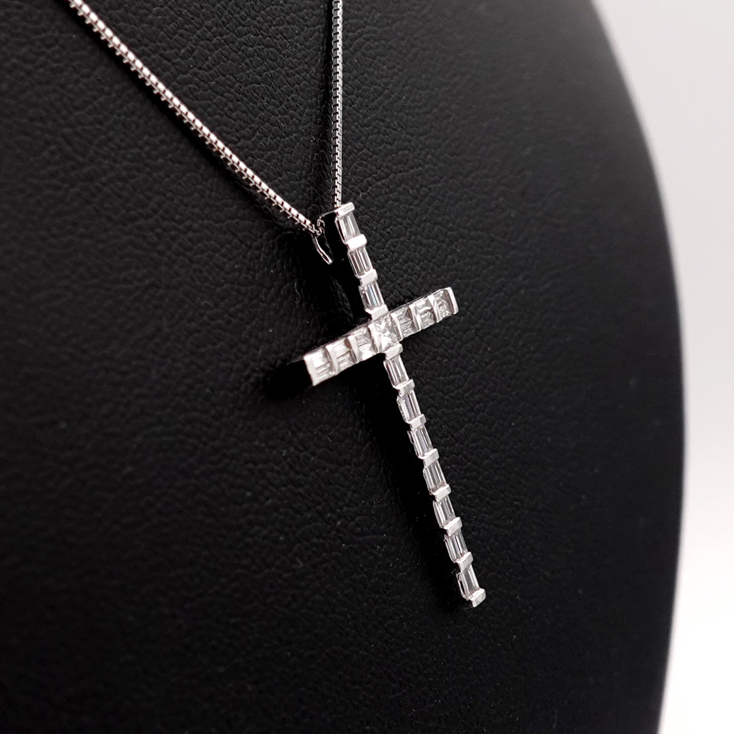 白色系で落ち着きのある輝きのバケットカットダイヤモンドを32個とプリンセスカットダイヤモンド1個(合計0.50カラット/33個)使用したシャープなデザインのクロスデザインペンダント。