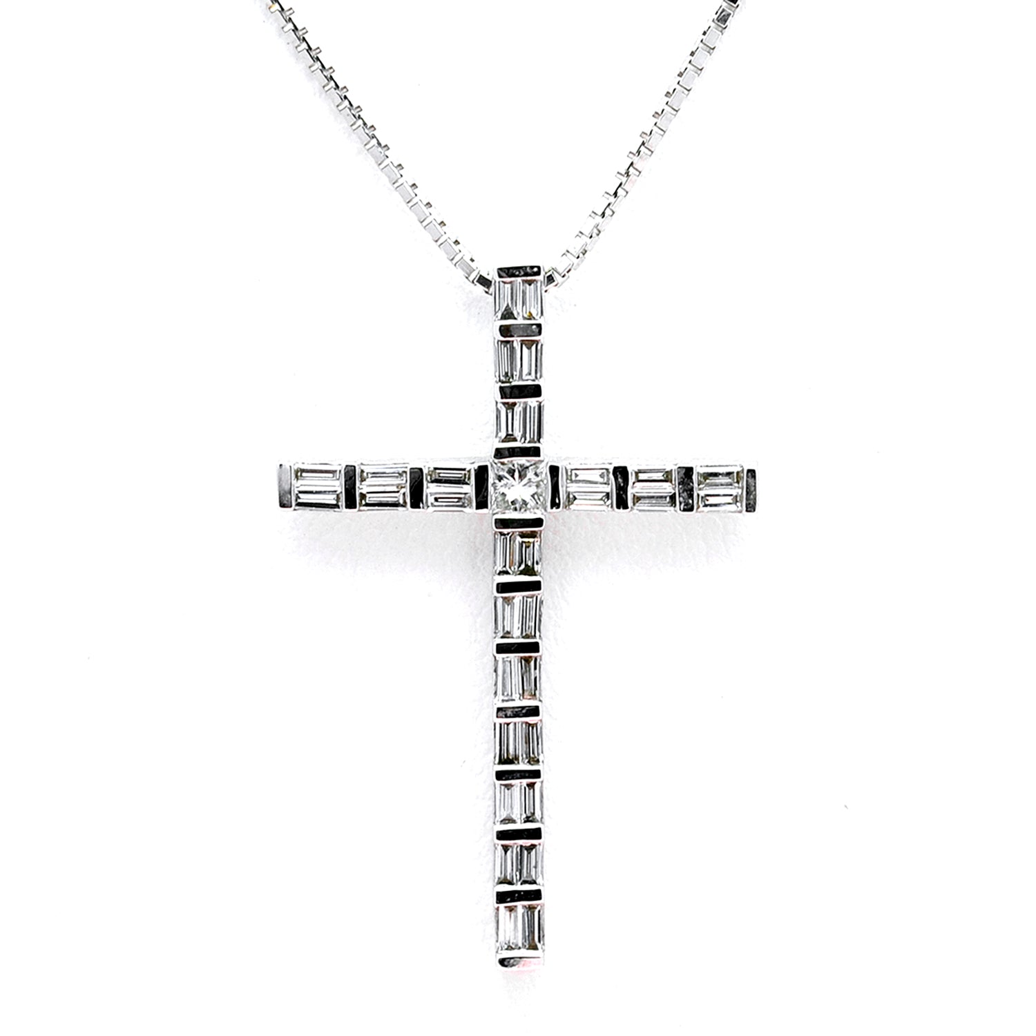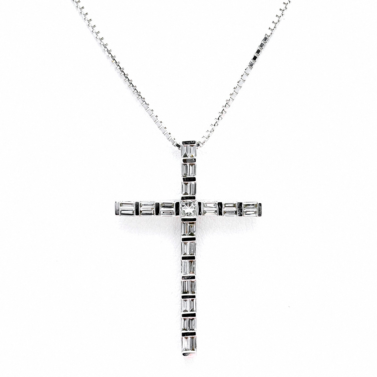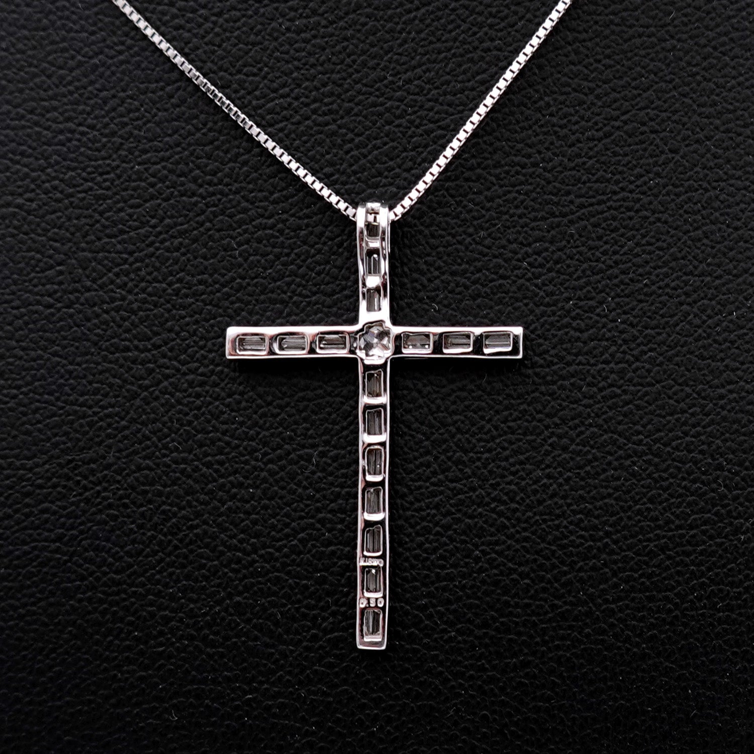 白色系で落ち着きのある輝きのバケットカットダイヤモンドを32個とプリンセスカットダイヤモンド1個(合計0.50カラット/33個)使用したシャープなデザインのクロスデザインペンダント。