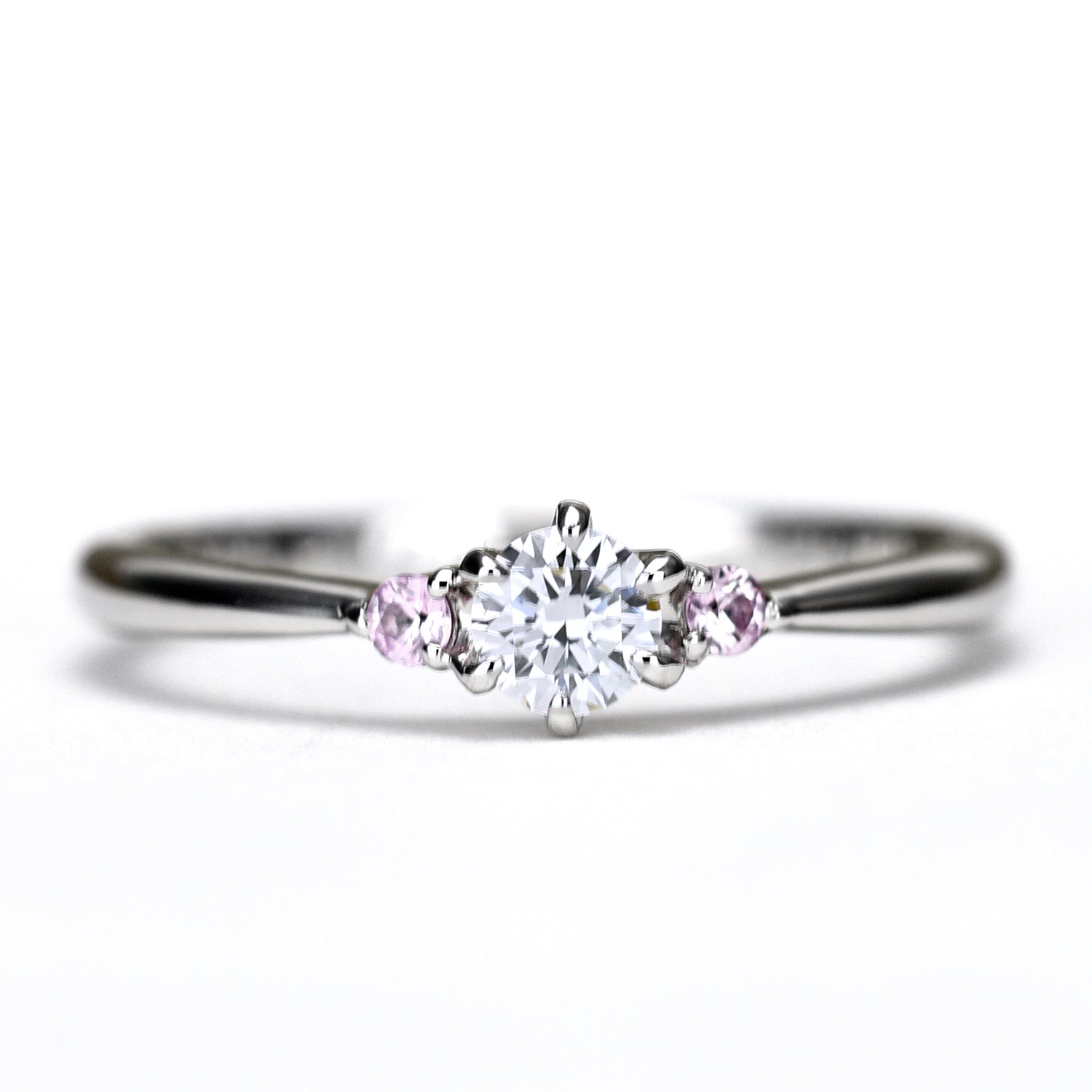 両サイドに希少な天然ピンクダイヤを2個セットした細身のエンゲージリング