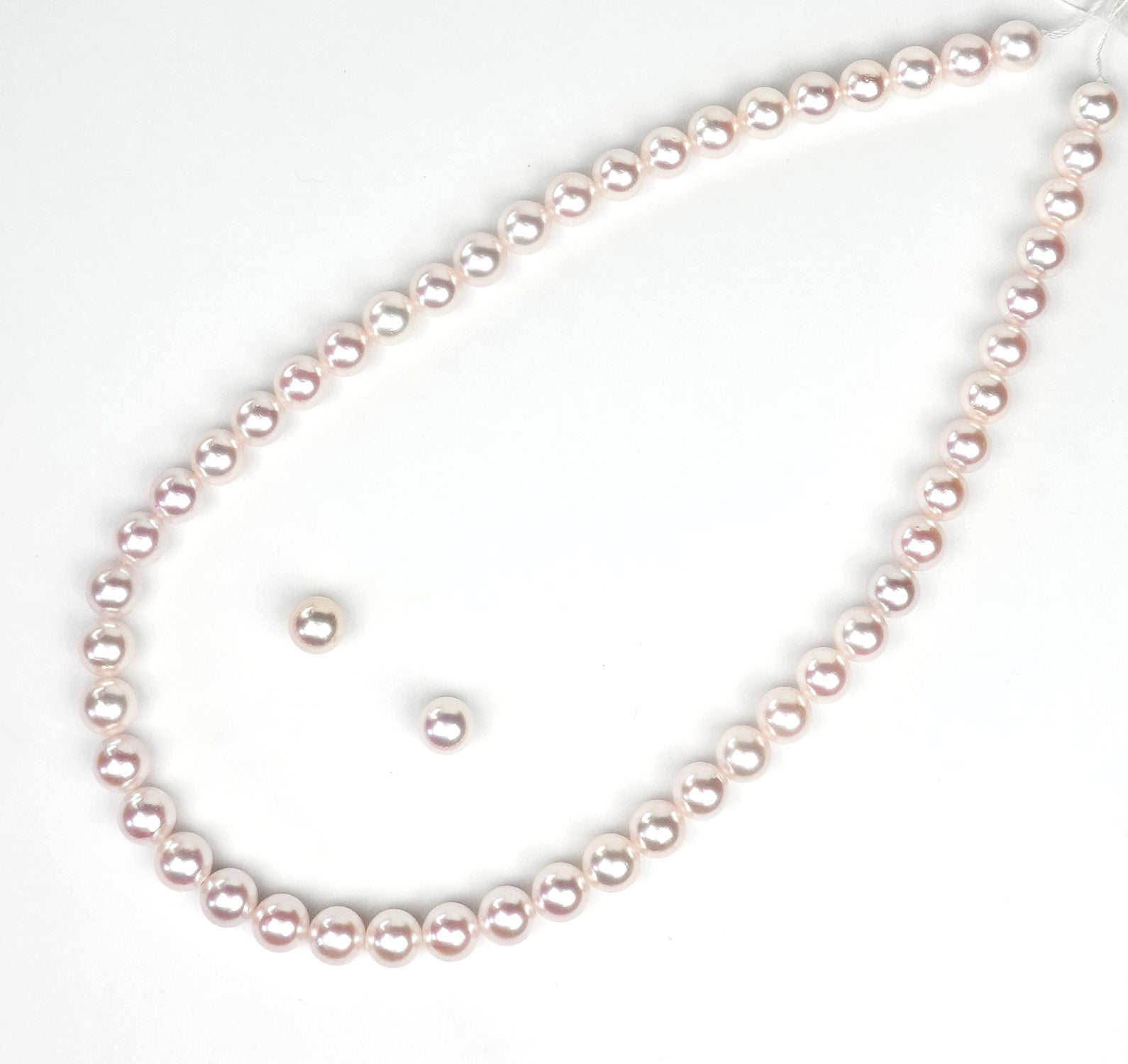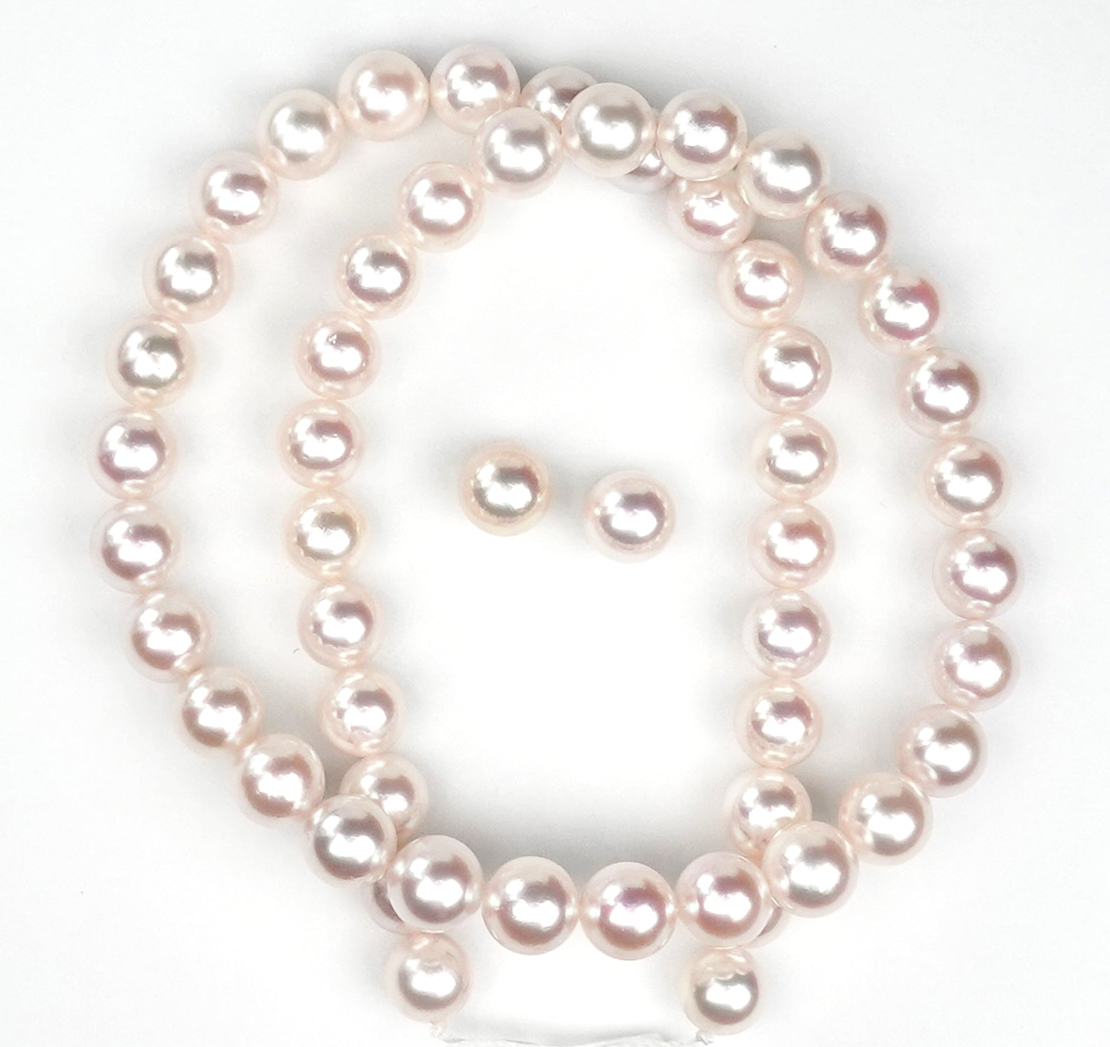 ピンク系の色味で、キズが少なく花珠に引けを取らない強い照りのある高品質な真珠ネックレスとペア珠。