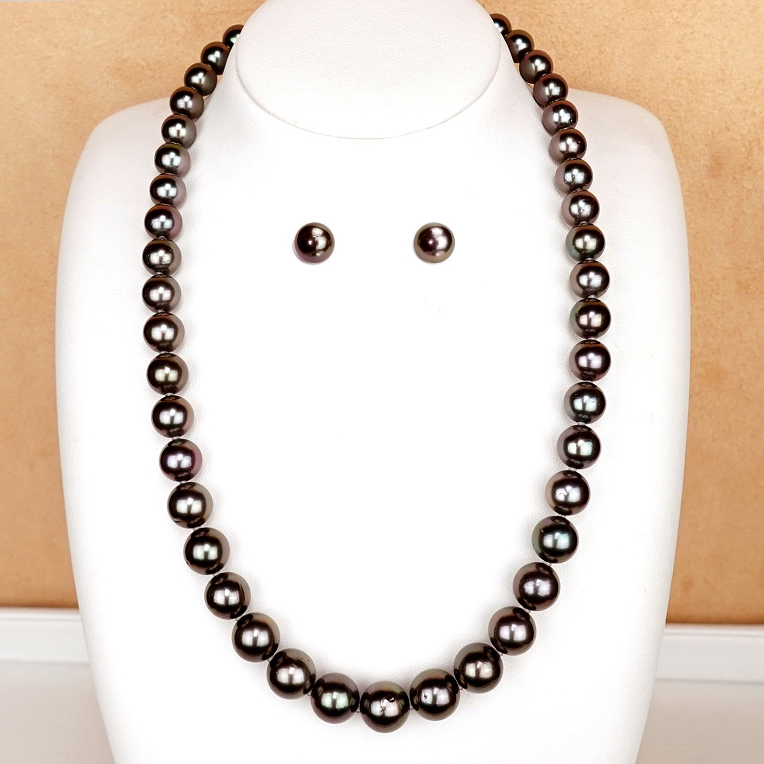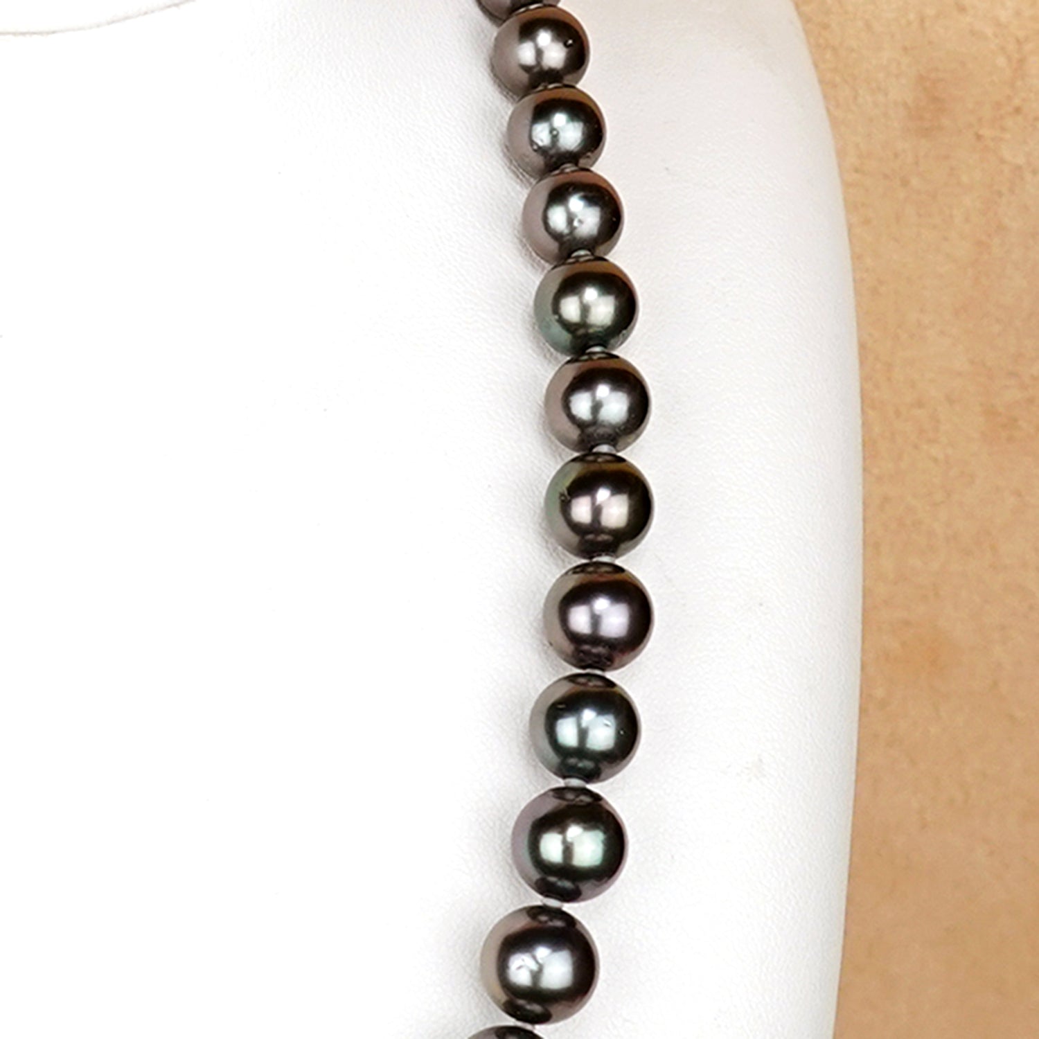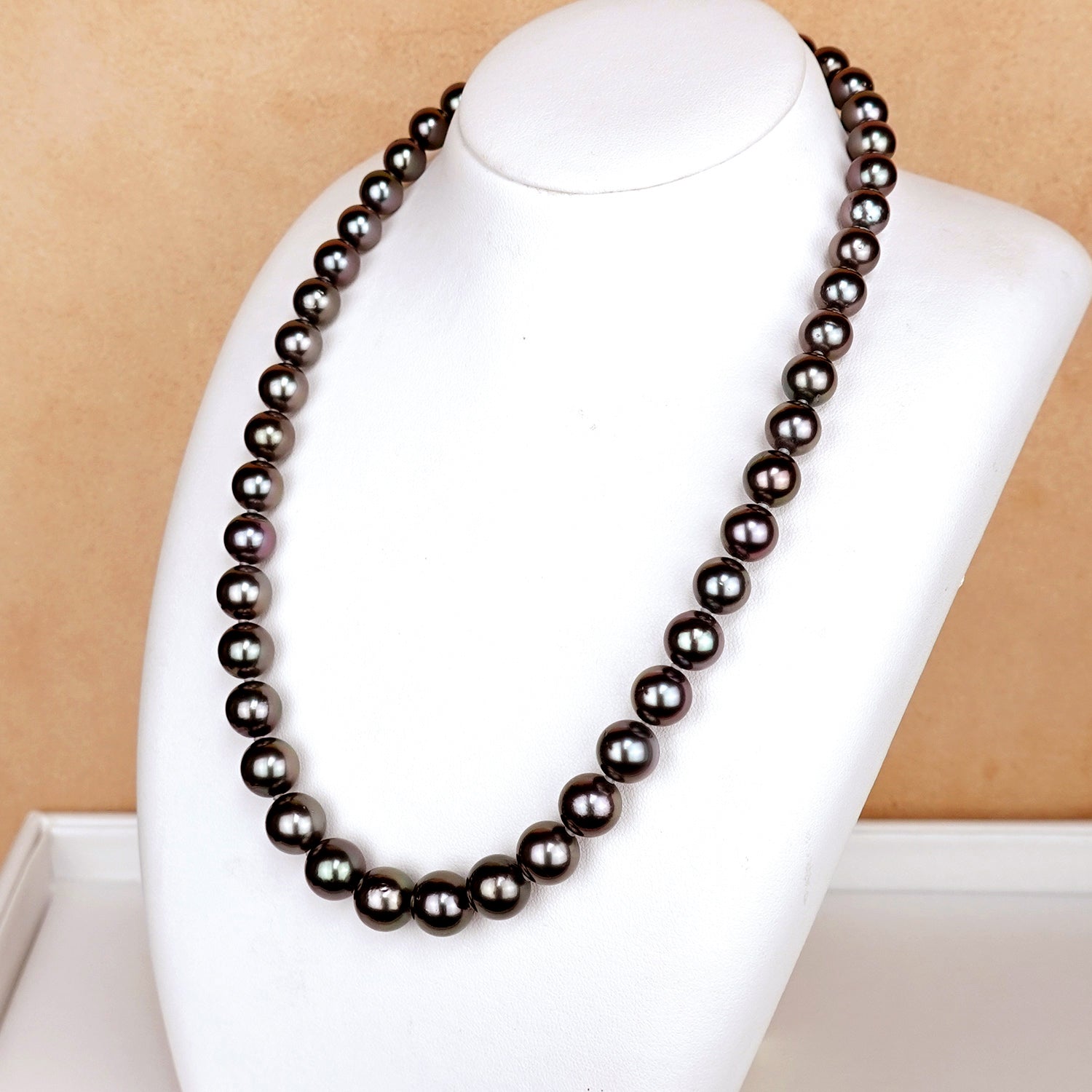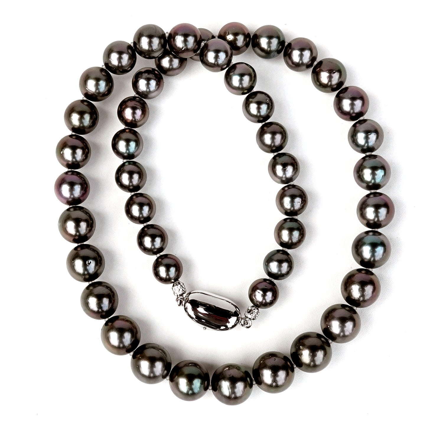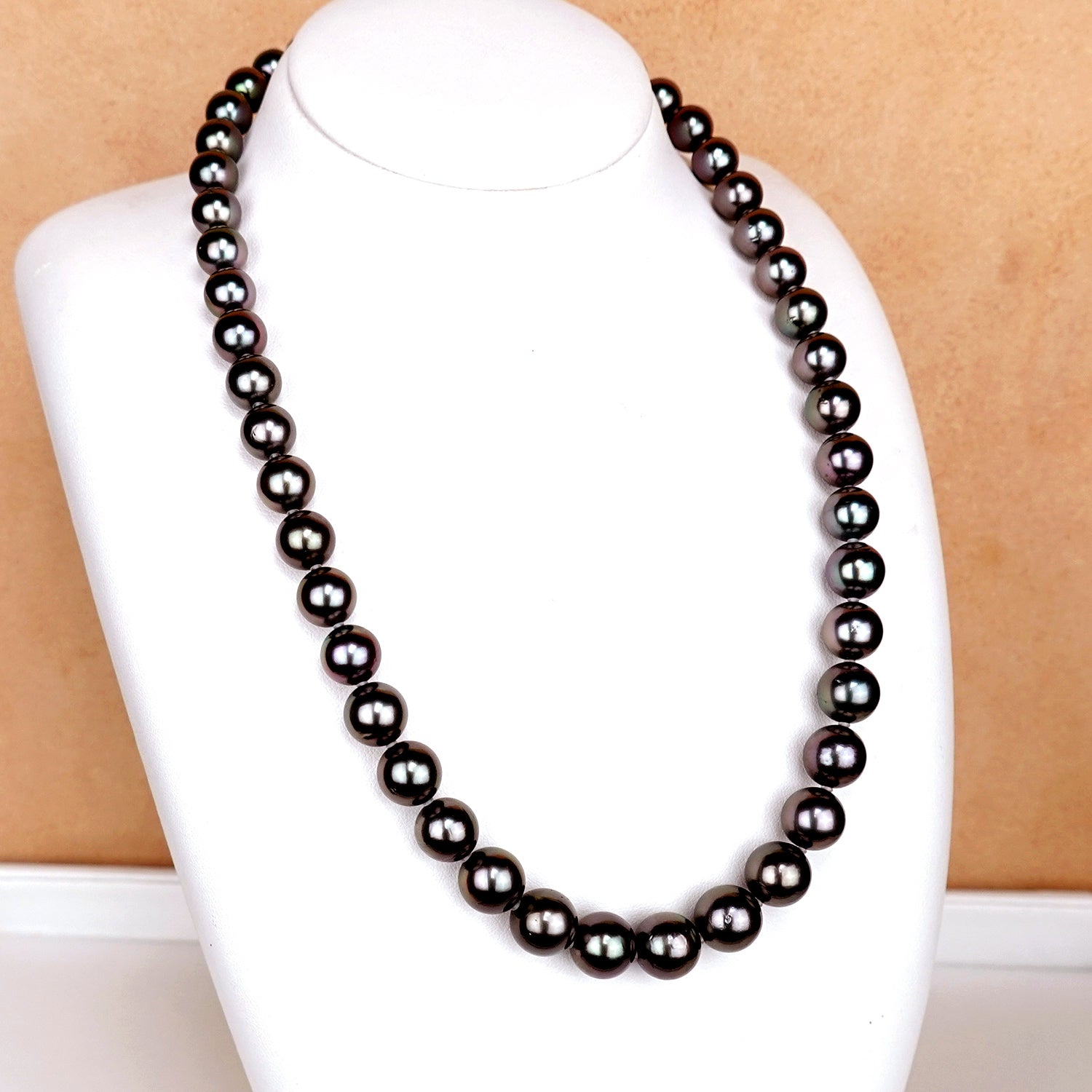 黒蝶真珠ネックレス【オーロラピーコック真珠科学研究所鑑定鑑別書付】グリーン系の色の中にレッドがかった光沢がある魅力的な色で、照りが非常に強い高品質な真珠