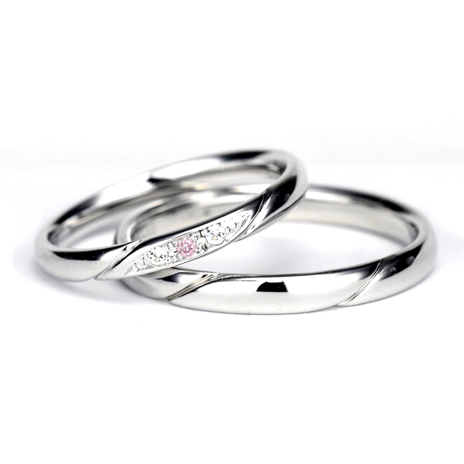 結婚指輪ペア ストレートデザインにウェーブパターンのアクセント 女性用には希少なピンクダイヤと高品質H&Cダイヤを使用 MpO13DBphO13