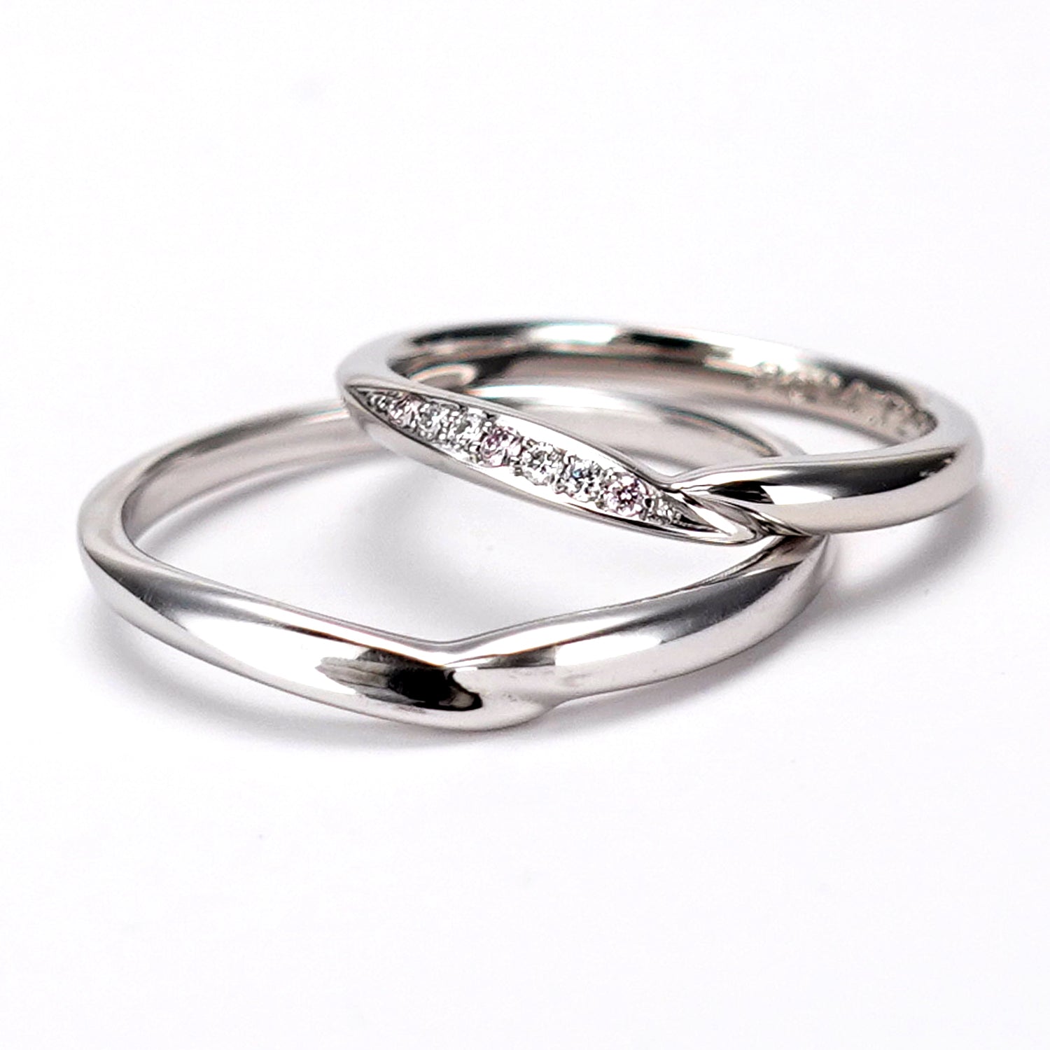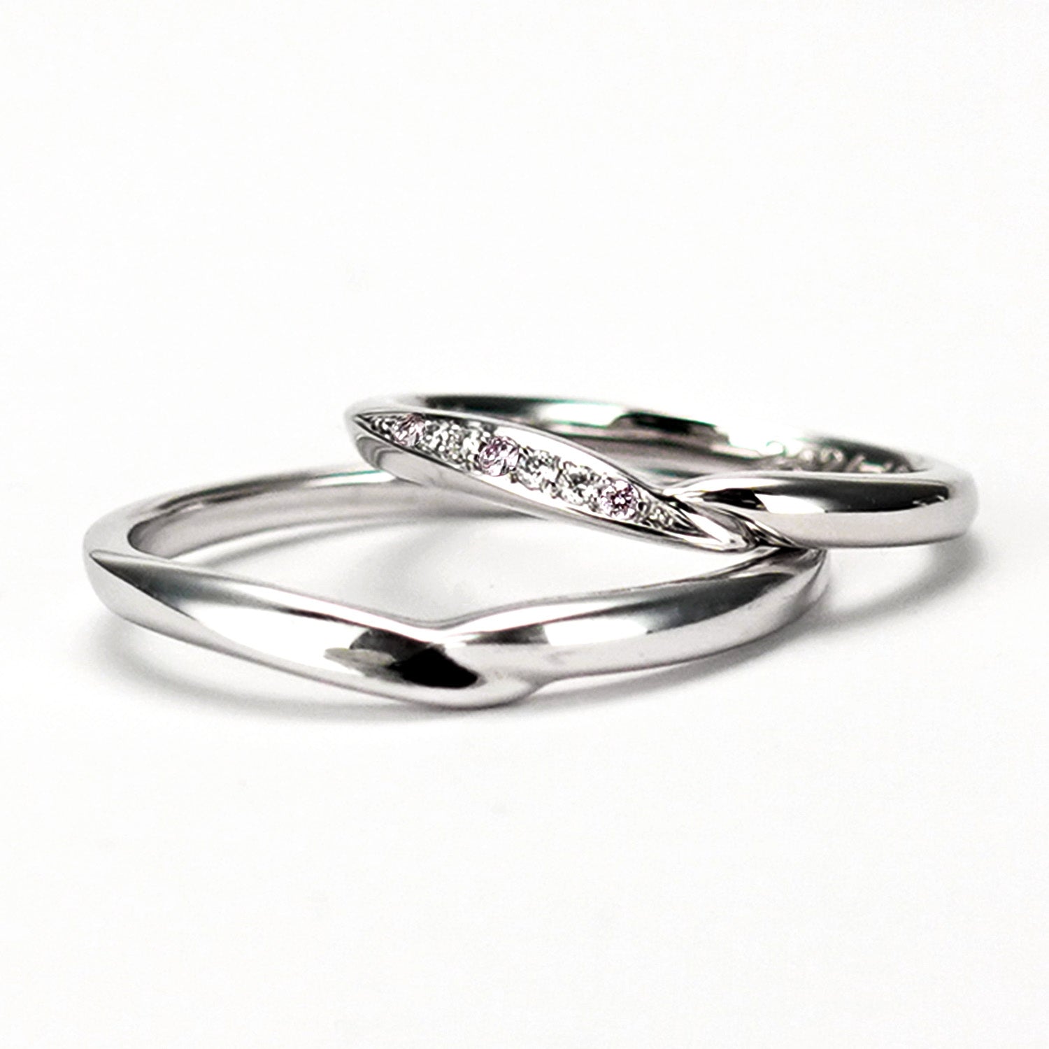 結婚指輪ペア 緩やかなウェーブとV字のデザインが融合した上品なデザインとアクセントの3個のピンクダイヤが特徴的 ハードプラチナを使用 MpODP04-Lp3M