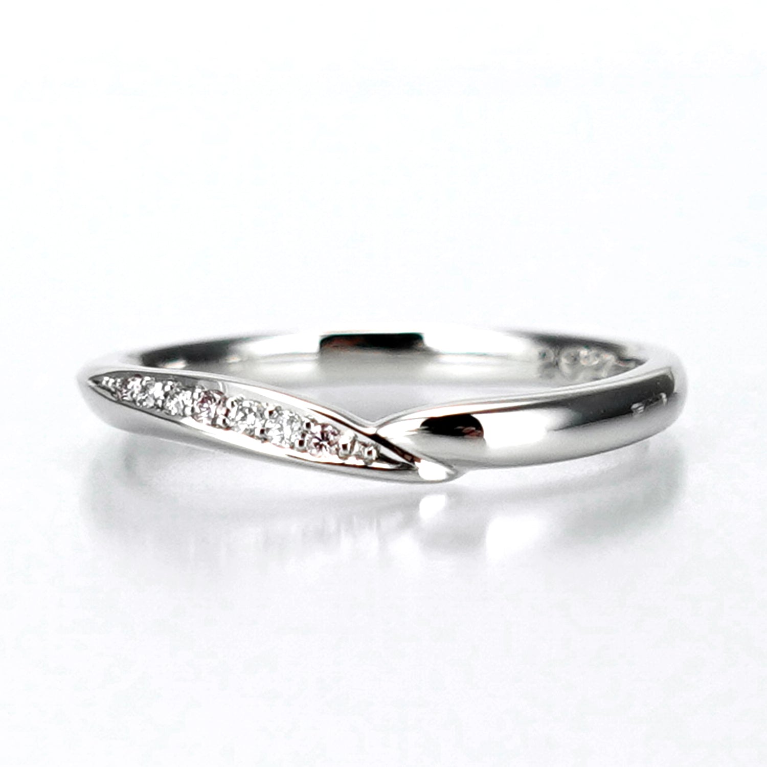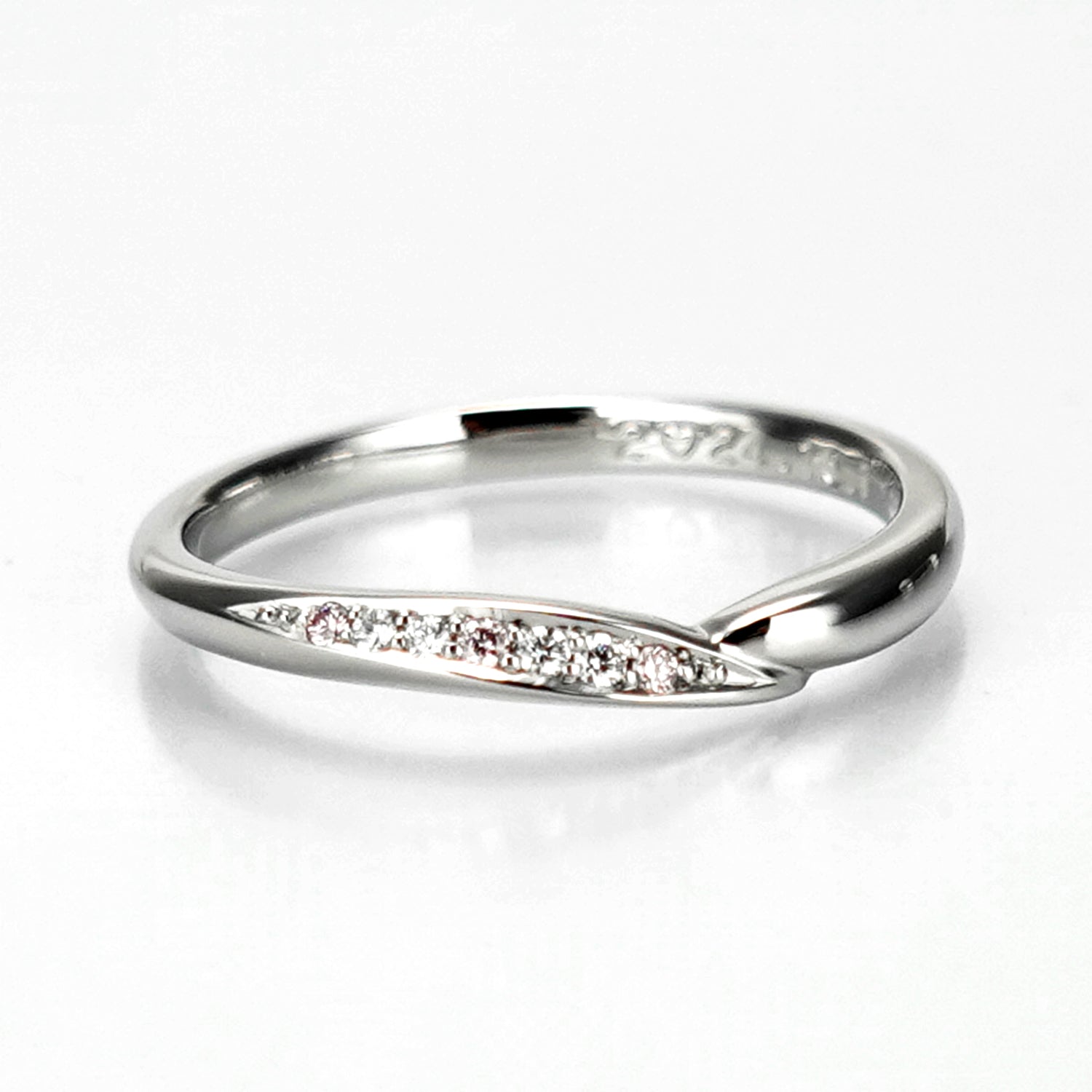 緩やかなウェーブとV字のデザインが融合した上品なデザインとアクセントの3個のピンクダイヤが特徴的