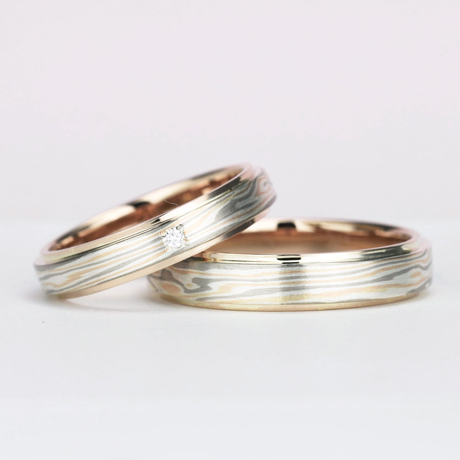 杢目金(もくめがね)結婚指輪ペア 世界に1つのだけの結婚指輪、日本独自の伝統工芸技法で手作り、女性用にH&Cダイヤモンドを使用 MpTHS01-DT-PG-S25Dh1-L30